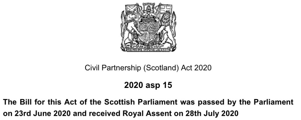 The Scottish government has now followed suit with the Civil Partnership (Scotland) Act having been passed by the Scottish Parliament in June and receiving Royal Assent last week. The secondary legislation which will need to be put in place to deal with the practicalities of the new law are being dealt with now, and it is anticipated that the first mixed sex civil partnerships will take place later this year. That is, of course, Covid-19 regulations permitting.