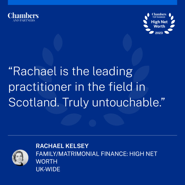 The current edition of Chambers quotes a client of Rachael's saying, "Rachael is the leading practitioner in the field in Scotland. Truly untouchable." with the 2023 Edition reporting that "Rachael is a pre-eminent family lawyer with a unique combination of legal brilliance and client care skills." "Her knowledge and technical expertise are phenomenal." "A formidable authority on family law in Scotland.".